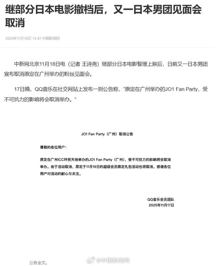 继部分日本电影暂缓上映后,日前又一日本男团宣布取消原定在广州举办的粉丝见面会。17日晚,QQ音乐在社交网站上发布一则公告称,“原定在广州举办的JO1 Fan Party,受不可抗力的影响将会取消举办。
